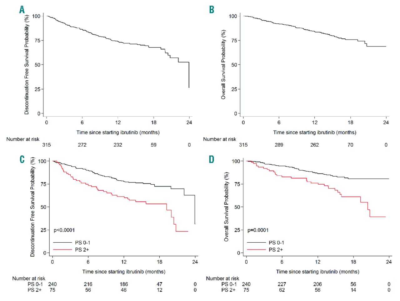Twenty-four percent discontinued ibrutinib at 138 months median follow-up. P 0001 and 63 high risk 83 intermediate and 93 low risk. P value not reported.