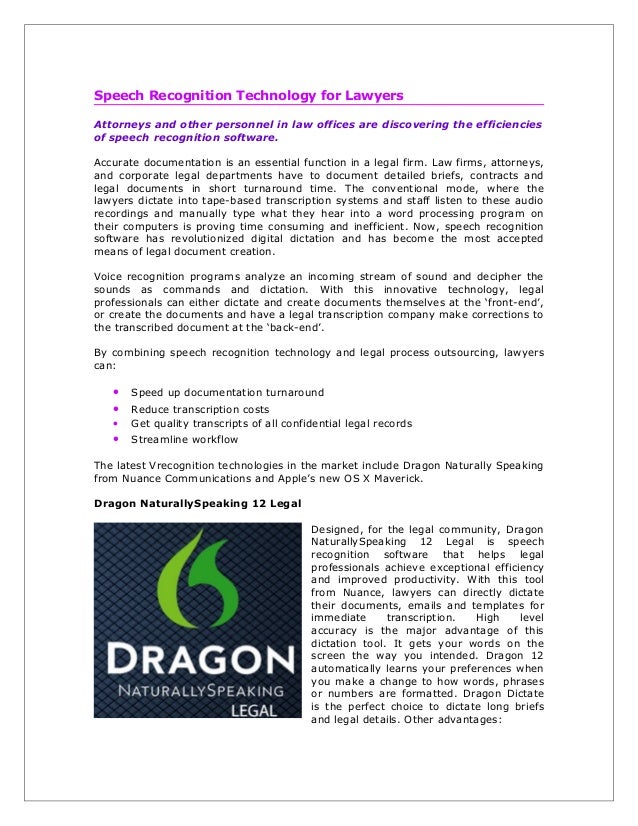 This helps lawyers save time and acts as an efficiency driver. Instead of typing you can dictate the substance of a document into your smartphone and then send it through a speech recognition software program. Dragon products are reliable easy to use and among the.